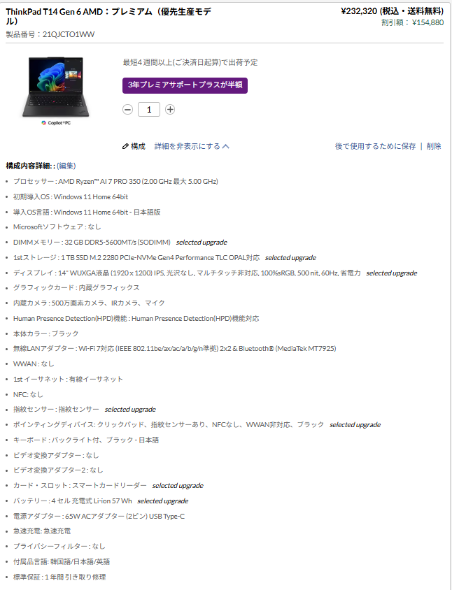 - 3 Copilot+ PC ThinkPad T14 Gen 6 AMD プレミアム(優先生産モデル)をカスタマイズして買った